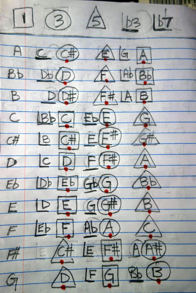 4) For the 7th chord add in the b7th indicated by the “corner” symbol.
